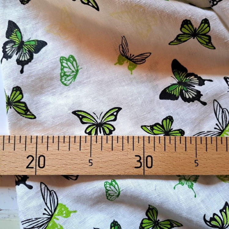Tkanina lniana z drukiem ( nie jest to druk cyfrowy) - Motylki. Druk zrobiony na białej tkaninie lnianej. Kolory - czarny, kilka odcieni zieleni.