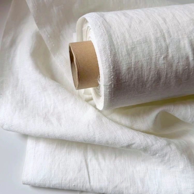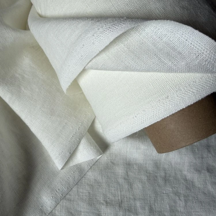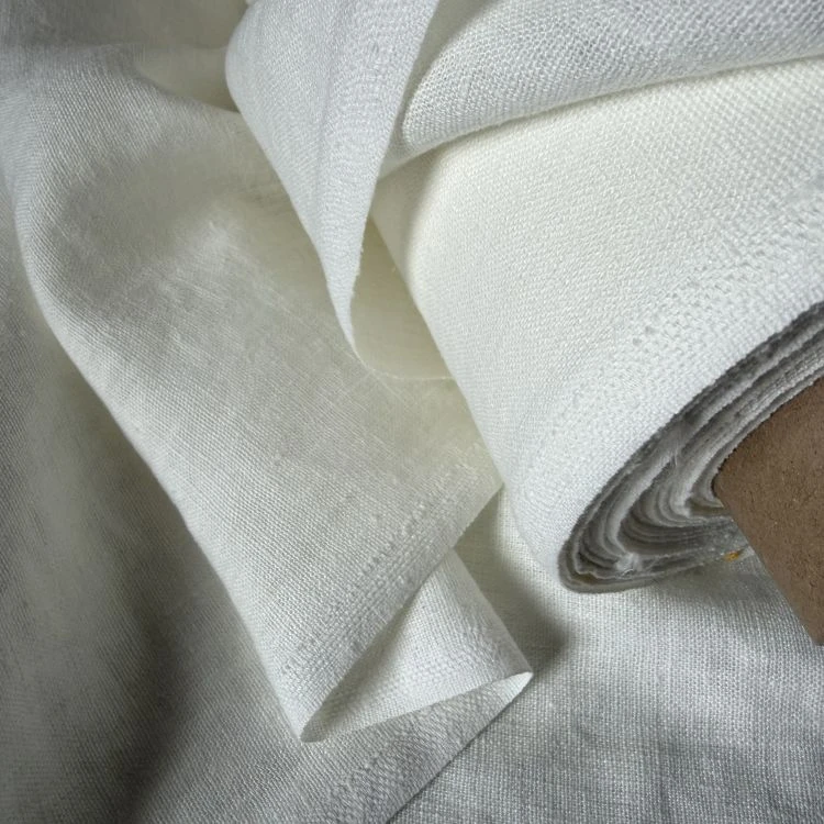 Tkanina lniana z przeznaczeniem na obrusy, zasłony lub inny dekoracyjny pomysł. Len w kolorze złamanej bieli. Lniana tkanina w kolorze złamanej bieli to kwintesencja naturalności i subtelnej elegancji. To odcień ciepły, miękki, delikatnie śmietankowy/kremowy – nie jest śnieżnobiały ani chłodny. Dzięki temu prezentuje się bardziej szlachetnie i przytulnie.